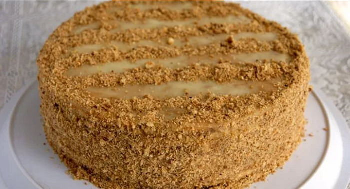 - Также промазываем верх и бока торта. Дальше приступаем к оформлению торта. Бока торта обсыпаем бисквитной крошкой (можно грецкими орехами).