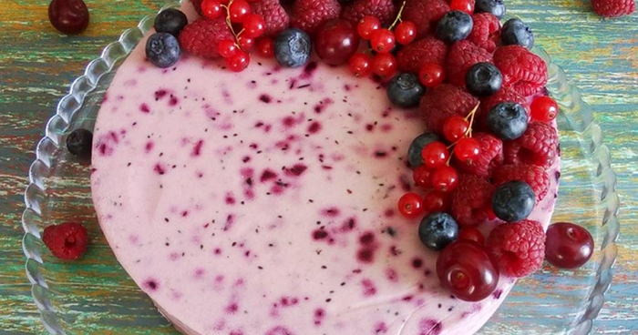 - Йогурт смешиваем с сахаром и взбиваем миксером до пышности. Вливаем желатин с молоком, перемешиваем, выливаем в форму для торта и на 20 минут убираем в холодильник.