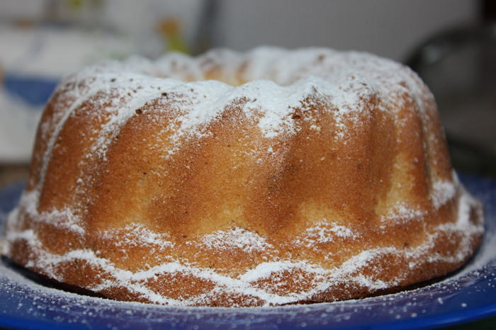 - Кекс выпекать около 60-80 минут при температуре 160 градусов. Готовность проверить деревянной зубочисткой. Дать полностью остыть, посыпать сахарной пудрой.