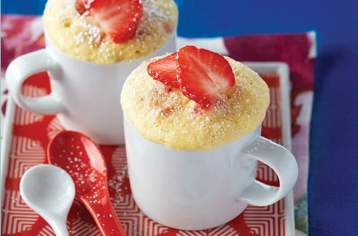 Клубника нарезается дольками. Отправляется в миску с тестом. Аккуратно перемешивается. Чтобы клубничные дольки не превратились в пюре для перемешивания, нужно использовать ложку. Дно чашки смазывается сливочным маслом. Чашка заполняется тестом на 2/3 от основного объема. Из получившегося может получиться два миниатюрных кекса в чашке объемом 200 мл. Чашка с тестом отправляется в микроволновую печь на 3 минуты. Кекс в чашке в микроволновке готов!