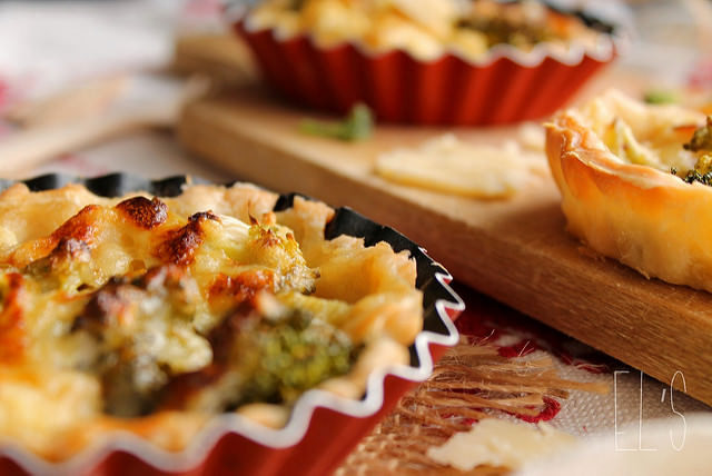 Разогреть духовку до 200 °. Разрезать капусту в небольших соцветиях и положить бланшировать в подсоленной кипящей воде в течение 4 минут. Раскатать слоеное тесто до 3 мм и вырезать кружочки размеров формочки тарталеток. Положите его в форму.