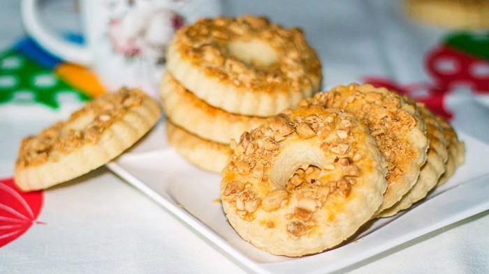 - Формочкой для кекса выдавить коржики. Сформированные коржики переложить на противень, помазать желтком и посыпать орешки.