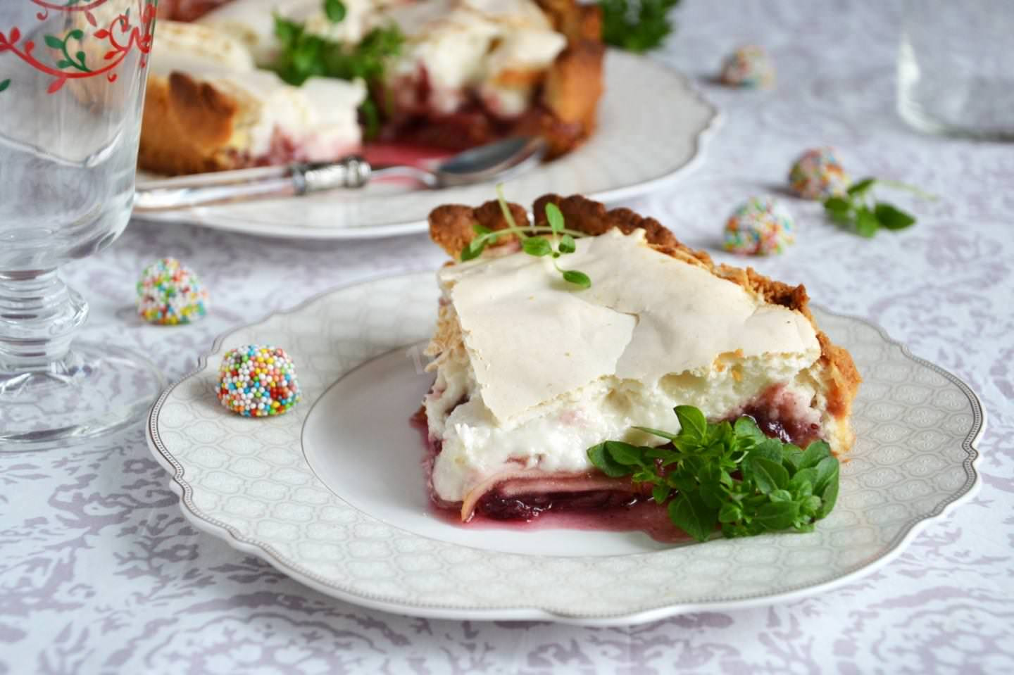 Из отложенного теста раскатать полосочки, выложить решетку на пироге. Выпекать пирог при 190 С до готовности, около 20 минут. При подаче можно посыпать сверху сахарной пудрой.