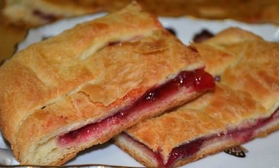 Слоеное тесто разморозить при комнатной температуре. Небольшую часть отложить, чтобы сделать на пироге решетку, а остальное раскатать по размеру формы в одном направлении. Раскатанное тесто положить в форму, сформировать небольшие ботики. Выложить клюквенную начинку.