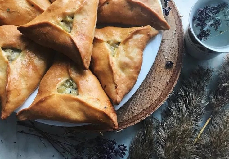 - Тесто нарезать кусками, как для пирожков, придать им форму шарика и раскатать лепешки величиной с чайное блюдце. На лепешки положить приготовленную начинку, приподнять с трех сторон края теста и защепить, а в середине оставить отверстие, чтобы получился треугольник.