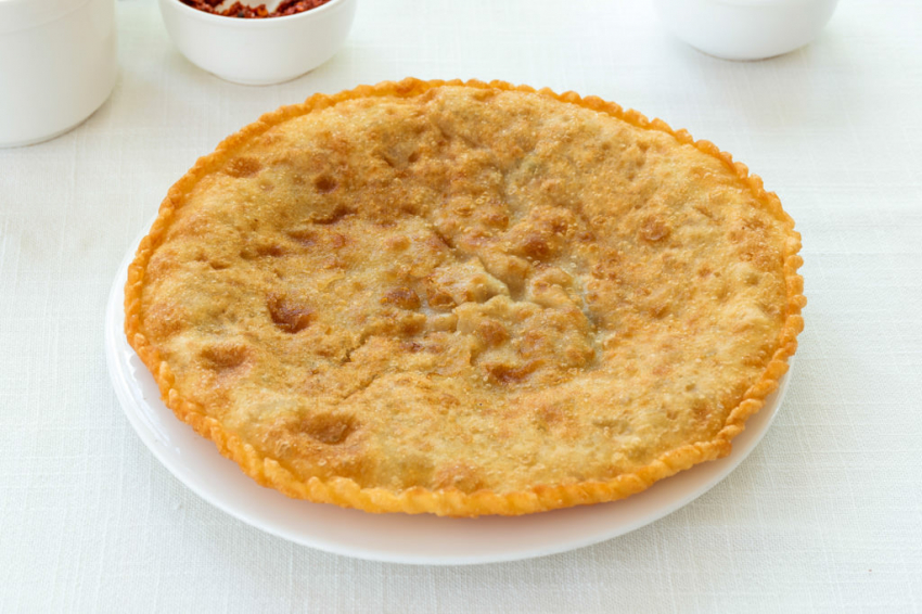 - На один пласт теста положите мясную начинку ровным слоем, отступая от краев по 1 см. Накройте сверху вторым пластом теста и защипните края. Сначала обжарьте лепешку на сковороде с обеих сторон до золотистой корочки, а затем 10 минут варите на пару. Поможет мультиварка или пароварка. Также можно устроить водяную баню с помощью дуршлага. Гошнан готов. Его можно подавать в качестве основного блюда или перекуса с любым соусом.