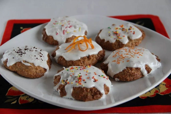 - Для приготовления глазури смешать сахарную пудру с 2–3 столовыми ложками воды. Горячие пряники покрыть глазурью и украсить.