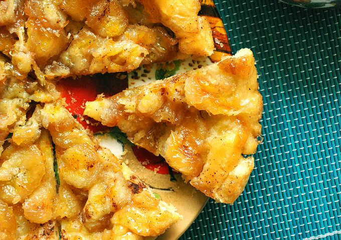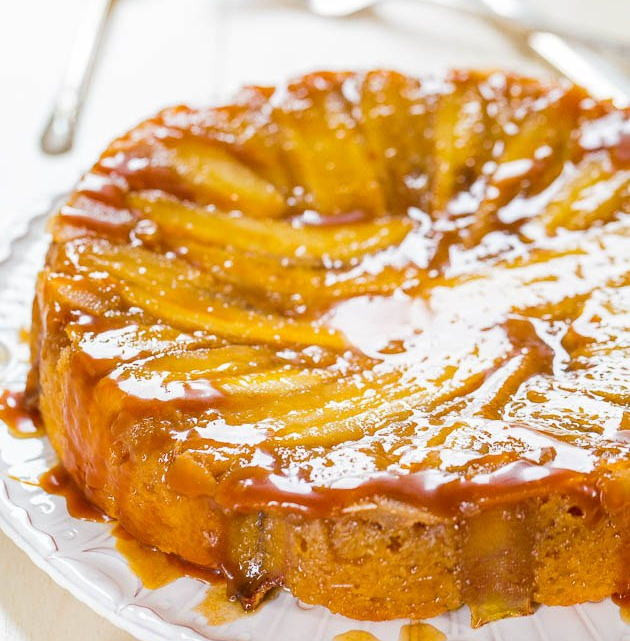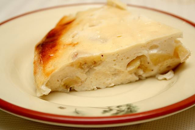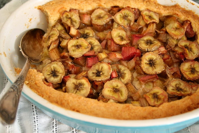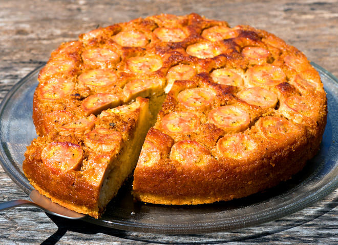 Доставать пирог из формы нужно пока он горячий, осторожно перевернув его так, чтобы бананы оказались сверху.