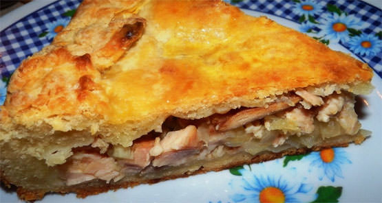 Замесите тесто из муки, молока, сахара и соли. Куриное мясо мелко нарежьте, соедините с измельченным бананом, перемешайте. Тесто раскатайте пластом, вырежьте из него два квадрата. На один положите начинку, накройте вторым и защипните края. Выпекайте в смазанной маслом форме при 190 °C 20 минут, затем еще 10 минут при 160 °C.
