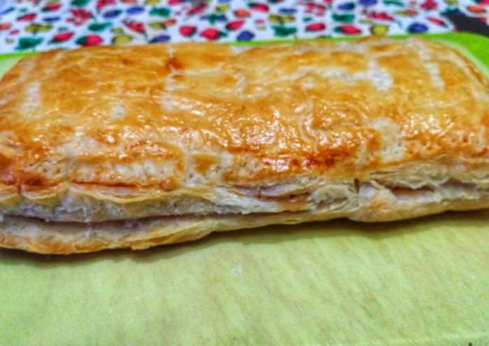 - Выложить на тесто начинку, завернуть, намазать сверху яйцом и проколоть вилкой верхушку