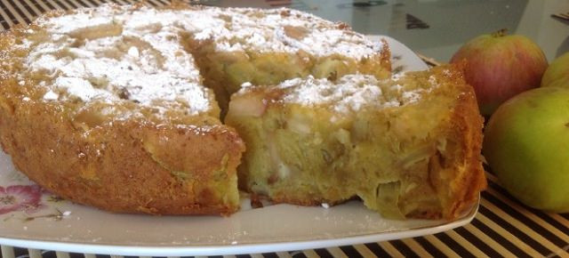 Готовый пирог-шарлотку чуть остужаем перед разрезанием на порционные куски.