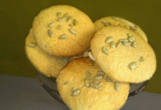 - Перекладываем печенье на противень, предварительно застеленный пергаментом и смазанный маслом. Посыпьте каждый белок сверху небольшим количеством семян.