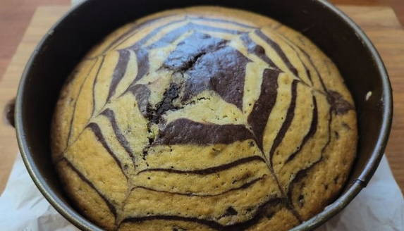 - Деревянной шпажкой нарисуйте полоски от центра к краям, образуя узор. Готовим «зебру» 35-40 минут при температуре 180 градусов.