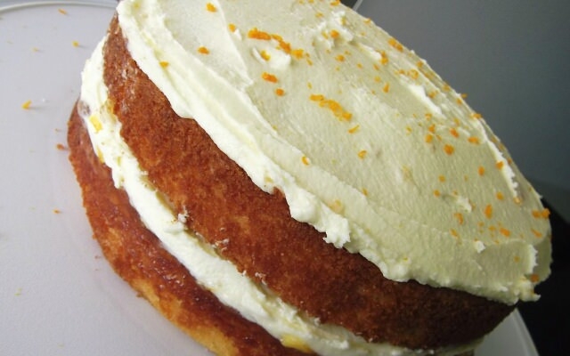 - Бисквит разрезать вдоль на 2 части, выложить на одну половину крем и накрыть второй. Обмазать торт оставшимся кремом, посыпать кокосовой стружкой.