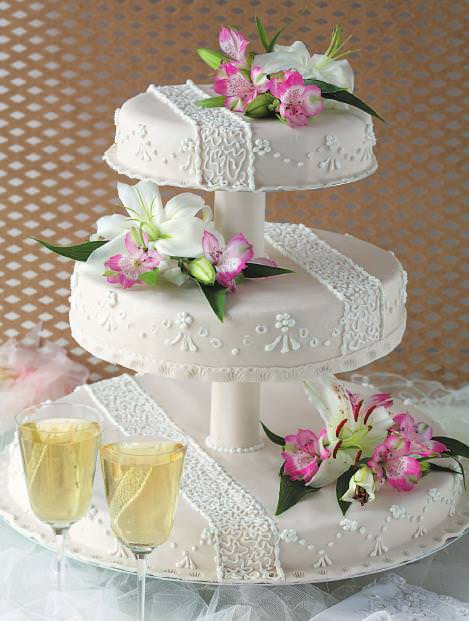 - Обтянуть торт сахарной пастой, белковым кремом и украсить живыми цветами. Аналогично приготовить два других яруса.