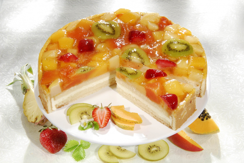 - Декорируют изделие кремом по бокам, сверху раскладывают кусочки фруктов, заливают их желе и помещают бисквитный торт с желе и фруктами на полку холодильника на пару часов.