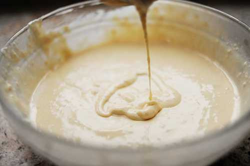 - Перемешаем тесто. Оно должно быть по консистенции как густая сметана — жидкое, но в то же время должно получиться пышным — в результате реакции кефира и соды.