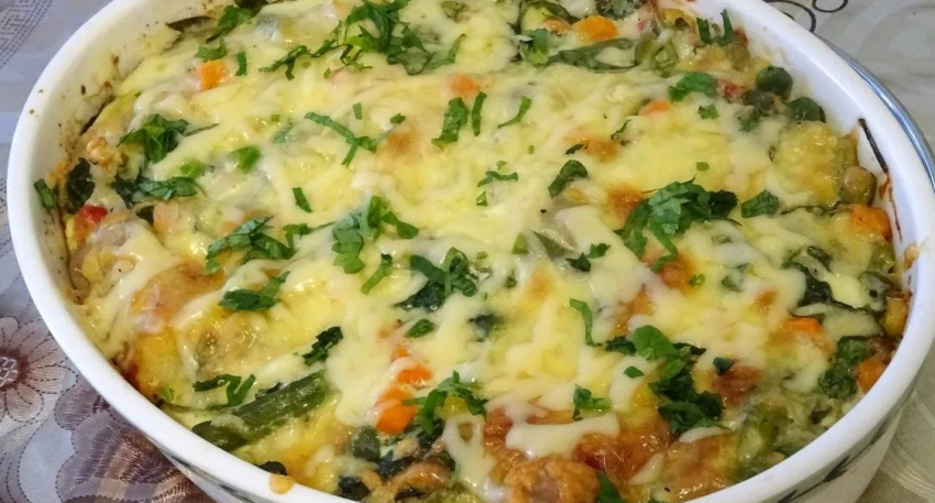 - Посыпать готовую запеканку «Ленивая жена» нарезанной свежей зеленью. Запеканка из пельменей готова. Приятного аппетита!