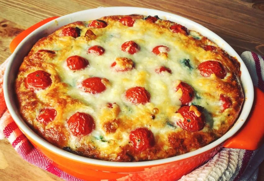 - Взбейте 4 яйца и смешайте их с майонезом. Залейте смесью пельмени, выложите поверх нарезанный ломтиками помидор, а затем покройте будущую запеканку натертым на мелкой терке сыром.