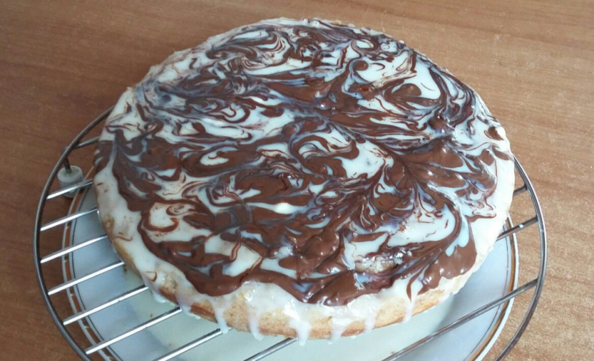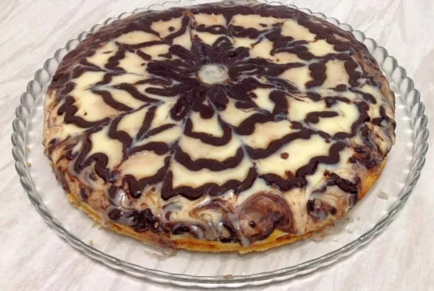 - Готовую ватрушку, не вынимая из формы, горячей залить смесью сметаны со сгущенкой, сверху по кругу ложечкой выложить растопленный шоколад и зубочисткой сделать разводы.