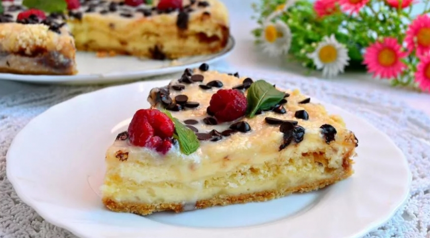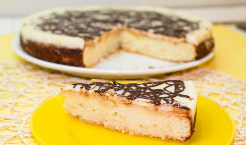 - Достаем горячую ватрушку из духовки и заливаем смесью сметаны и сгущенки. Поверх заливки разливаем растопленный шоколад. Это можно делать с помощью кондитерского мешка, а можно просто поливать тонкой струйкой из ложки.