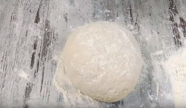 Теперь необходимо тщательно вымесить тесто, поэтому выкладываем его на стол, подпыленный мукой, и месим минут 10-15, пока оно не перестанет липнуть к рукам. Получившуюся эластичную и гладкую массу скатываем в шар и оборачиваем на 15 минут влажным теплым полотенцем.