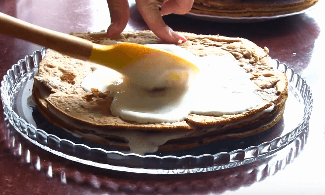 - Каждый корж нужно густо смазать полученным кремом, укладывая коржи друг на друга. Последний верхний тоже смазать, посыпать крошкой.