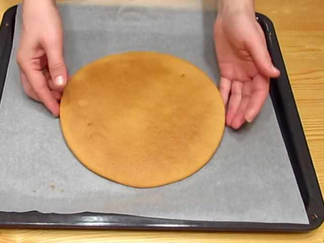 - Разделить остывшее тесто на 7 равных частей. Использовать муку для посыпания стола, если тесто слишком липкое. Разогреть духовку до 180°С. Раскатать каждую часть теста в пласт круглой формы. Противень выложить бумагой для выпекания, немного смазать. Выложить на него пласт или два и выпекать 3 мин. Последний, седьмой корж, запечь до более коричневого цвета, раскрошить его для посыпки торта.