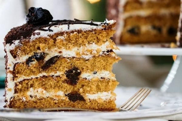 Мед смешайте с разрыхлителем, поставьте на водяную баню, готовьте, постоянно помешивая, до полного растворения меда. Яйца взбейте с сахаром, добавьте к ним медовую смесь. Муку просейте, всыпьте в яйца и мед. Замесите тесто. Чашу мультиварки смажьте сливочным маслом, влейте тесто, установите режим «Выпечка» и готовьте в течение 2 ½ ч. После звукового сигнала оставьте бисквит в режиме «Подогрев» на 10 мин. Готовый бисквит выньте из мультиварки при помощи емкости для варки на пару. Остывший бисквит разрежьте на 3 коржа. Чернослив замочите в теплой воде на 20 мин. Для крема сметану взбейте с сахаром. Каждый корж смажьте кремом, положите на него чернослив. Готовый торт поставьте в холодильник на 6–8 ч.