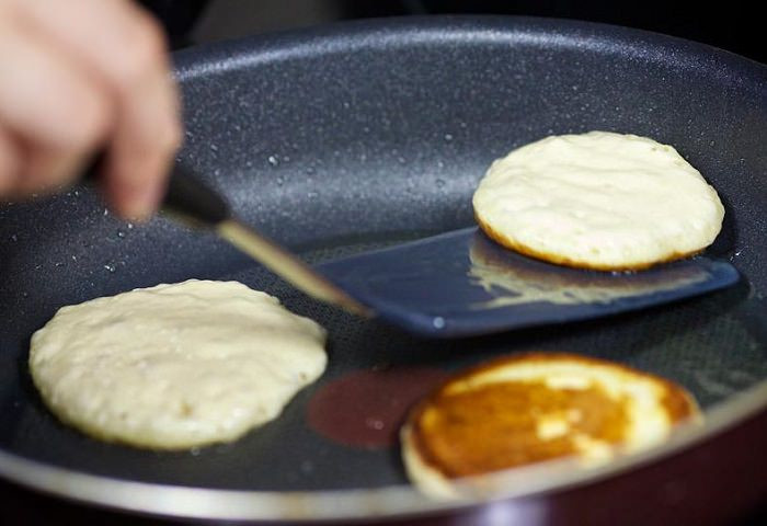 - Выкладывать тесто нужно только на хорошо раскаленную сковороду.