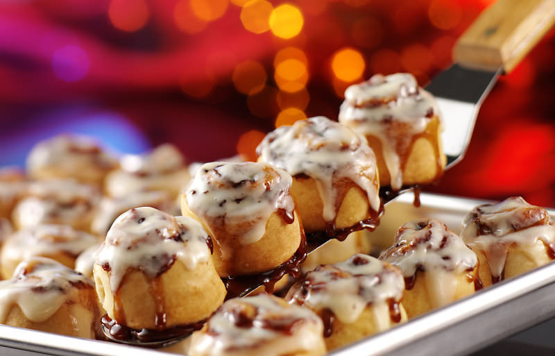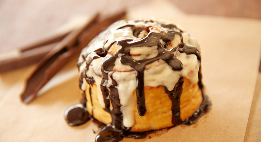 - После того как готовые булочки синнабон будут извлечены из духовки и политы кремом, они также дополнительно украшаются и тонкими нитями шоколадной глазури.
