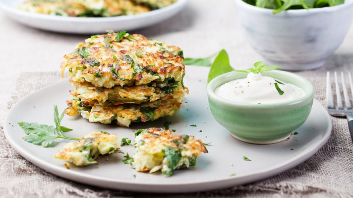 Нагреваем духовой шкаф до температуры 190 градусов Цельсия. Запекаем по 4-5 минут с каждой стороны — когда поджарится одна сторона, достаём противень, аккуратно переворачиваем оладушки, и снова ставим противень в духовку. К столу оладьи из цветной капусты подаём горячими, с пылу с жару. По вкусу приправляем сметаной или греческим йогуртом.