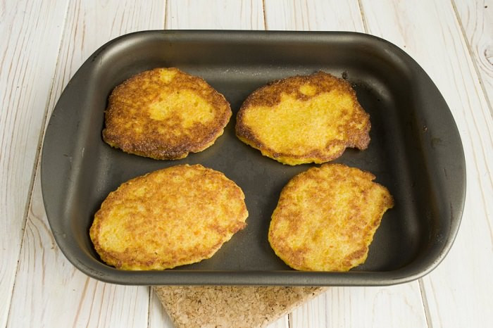 - Жарим на среднем огне до румяной корочки, с двух сторон. Если сомневаетесь, пропеклись ли, накройте крышкой во время обжарки второй стороны.