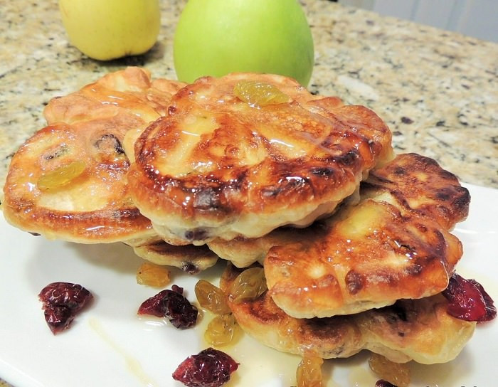 Добавление в оладьи наливных яблочек делает вкус лакомства насыщенным и необычным. Если вам недостаточно сладости, вмешайте в тесто, помимо изюма, мелко нарезанный и предварительно ошпаренный чернослив.Ингредиенты: