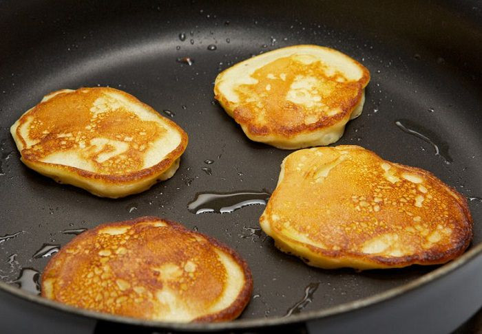 - Дрожжевые оладьи можно готовить на несильном огне, каждая сторона обжаривается 2-3 минуты.