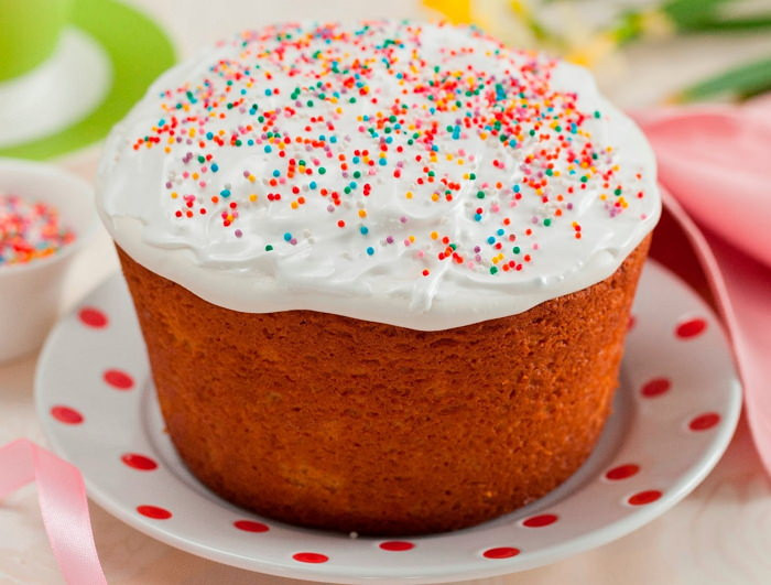 - Украшаем кулич традиционно: сахарной глазурью. Для нее взбиваем яичные белки с сахарной пудрой и несколькими каплями лимонного сока в крепкую пену, а потом покрываем верх куличей глазурью при помощи кулинарной кисточки. При желании можно посыпать паски разноцветной сладкой посыпкой, которая продается в магазинах. Главное сделать это сразу, чтобы она застыла вместе с глазурью.