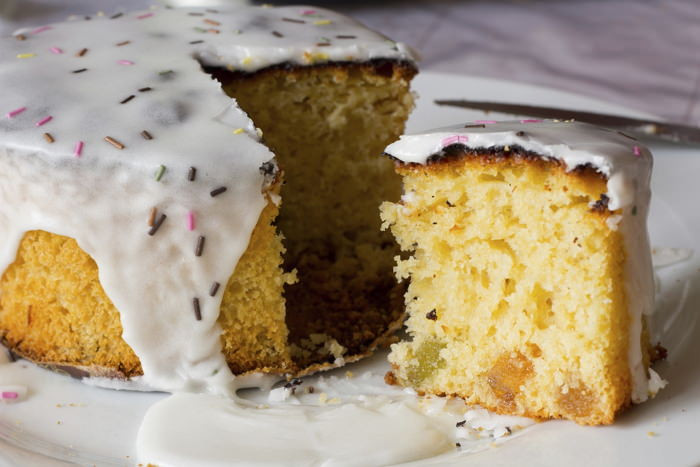 Готовый кулич покрывают глазурью, посыпают орехами и/или цукатами. Кстати, разрезают его не вдоль, а поперек, верхушку сохраняют и накрывают ею оставшуюся часть, чтобы она не засыхала.