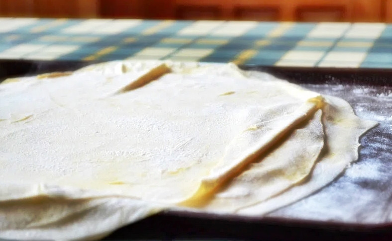 - Продолжаем работу с тестом. Для того, чтобы раскатать тесто, разрежьте шар на 8 частей и скатайте шарики. Раскатывайте их по одному. Сначала расплющьте шарик в лепёшку, а затем раскатайте скалкой на доске от середины к краям, подсыпая муку. Чем тоньше Вы раскатаете тесто, тем лучше. На фото видно, что тесто пропускает свет. Диаметр лепёшек должен быть больше диаметра формы на 3-4 см. Раскатанные листы теста складывайте на поднос, пересыпая мукой, чтобы не слиплись. Пусть тесто полежит. Так же можете попробовать приготовить вкусный пирог с сыром.
