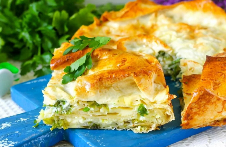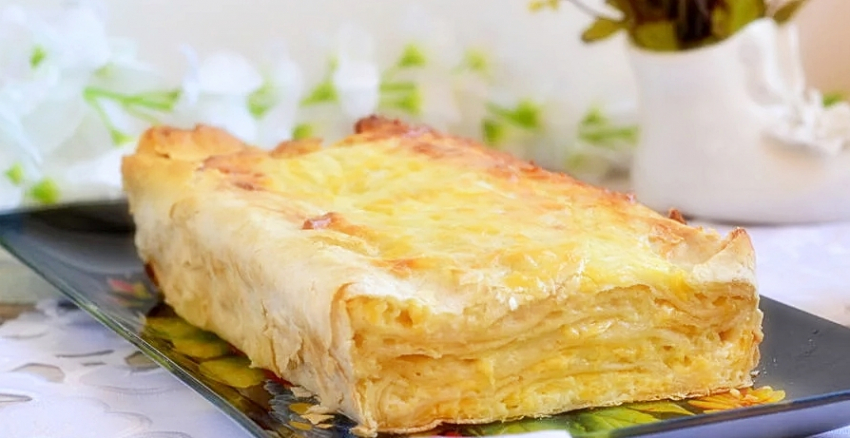 - Всё выше описанное проделайте с третьим и четвёртым листами теста: отварите, остудите, уложите в форму, смажьте маслом. Выложите подготовленный сыр на четвёртый слой теста и разровняйте. Возвращайтесь к печке и отварите поочерёдно пятый, шестой и седьмой листы теста. Остужайте и укладывайте их друг на друга, смазывая маслом.