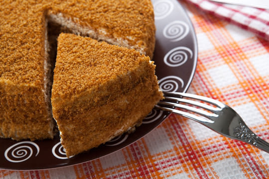 Кстати, медовик делают и с масляным кремом: для этого мягкое сливочное масло (не менее 82,2 % жирности) взбивается с вареной сгущенкой в течение 10–15 минут, пока масса не увеличится в объеме. Если промазывать коржи разными кремами, чередуя слои, торт приобретет оригинальный вкус, поскольку сметанная кислинка приятно оттенит сладость сгущенного молока и медовик получится не таким приторным.