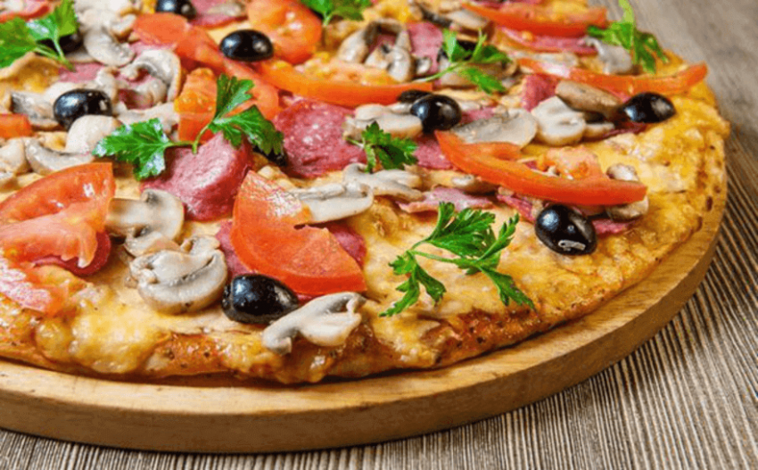 - Отправляем пиццу с луком, грибами и колбасой в духовку, разогретую до 250 градусов, на 15-20 минут.