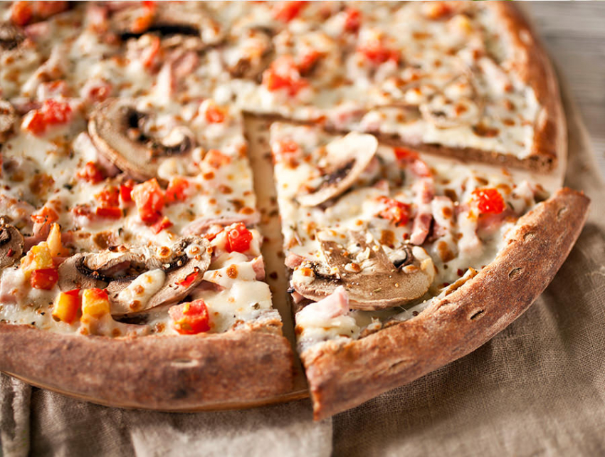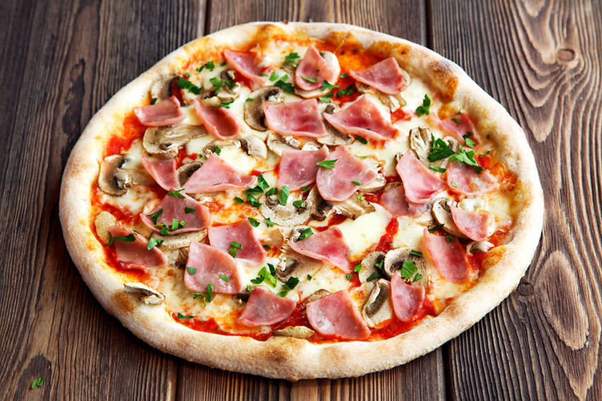 - Основу для пиццы смазываем оставшимися 2 ст.л. лимонного оливкового масла. Выкладываем грибы и ветчину.