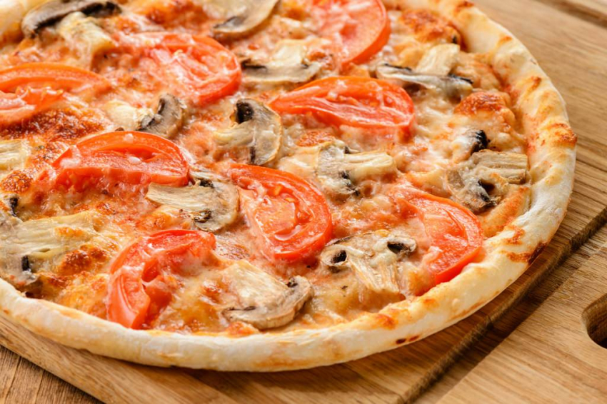 - Сверху выкладываем начинку и посыпаем тертым пармезаном. Запекаем пиццу при 180С около 25 минут. Готовую пиццу режем на кусочки и подаем горячей.