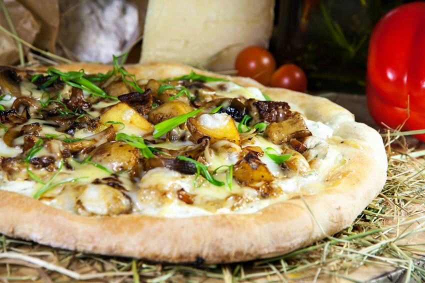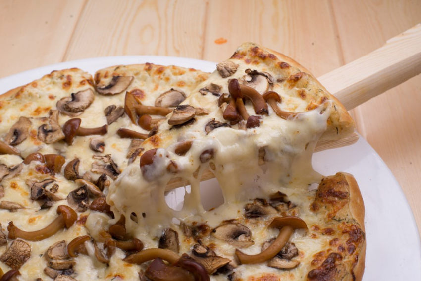 Пицца с грибами в духовке, с луком и сыром под чесночным соусом