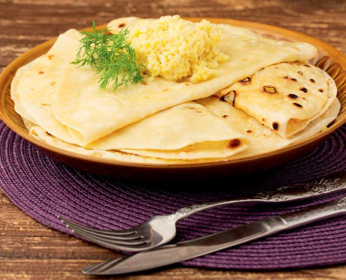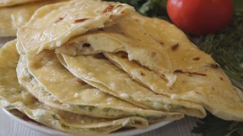 - На одну половину лепешки положить картофельную начинку, согнуть лепешку пополам и закрыть начинку второй половиной. Лепешки обязательно должны быть горячими, иначе они будут ломаться при сгибании.
