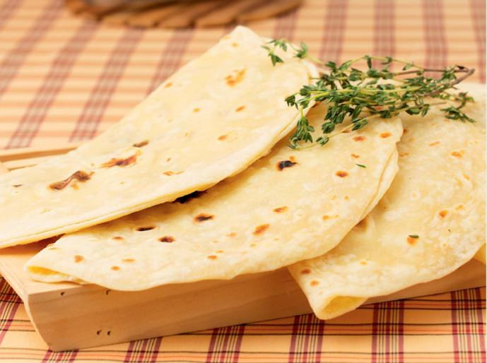 - Готовое пресное тесто разделать на куски примерно по 75–80 г, раскатать из них тонкие круглые лепешки и выпечь, переворачивая, на раскаленной сухой сковороде до образования румяной корочки.