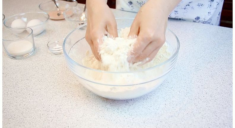 В мучной крошке делаем лунку, вливаем сметанную смесь и быстро замешиваем тесто. Долго месить тесто не нужно, замешиваем его как можно быстрее. Основная задача – добиться однородности, этого будет вполне достаточно. И поскольку мука везде разная, то в ходе замеса вам может понадобиться добавить ещё немного муки, если вдруг тесто получается очень мягким и липким. Заворачиваем тесто в пищевую плёнку и отправляем на час в холодильник.