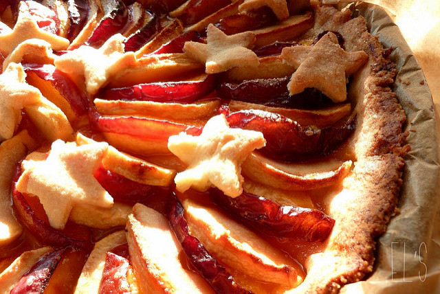 Смешать миндальный порошок и сахар и посыпать на тесто. Вымойте, очистите и нарежьте фрукты на дольки, выложите на тесто, чередуя персик и яблоко. Посыпать ванильным сахаром и выпекать в течение 35 минут.