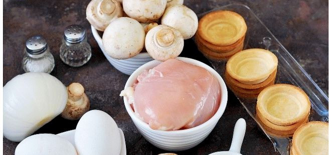 Замечательная закуска для праздничного стола. Это вкусно и красиво! Тарталетки с начинкой – это всегда желанное украшение стола. Они хороши и на Новый год, и на день рождения, и на любой другой праздник. Подойдут они и для шведского стола, и для перекуса в дороге, и на пикник (если правильно и аккуратно упаковать). Одним словом, вариантов их применения – великое множество… Удобно то, что заготовки можно напечь заранее, а наполнить любой начинкой в день торжества и подать любимым гостям. Тарталеток можно сделать сразу много. Начинка из грибов и курицы вкусна и делает их очень сытным блюдом.Ингредиенты