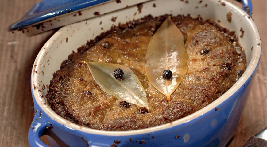 Измельчите содержимое блендера, затем добавьте муку, молоко и приправы и продолжайте измельчать до полной однородности. В противень, наполненный водой, поставьте миски и перелейте в них печеночную массу. Аккуратно поставьте противень в духовку и запекайте около часа. Проверьте готовность – спица или тонкий нож должен выходить из паштета чистым – и вынимайте из духовки. Дайте паштету немного остыть, затем уложите в каждую миску по лавровому листу, залейте небольшим количеством растопленного сливочного масла и уберите в холодильник. Вы можете подавать паштет спустя несколько часов или хранить в холодильнике до пяти дней.